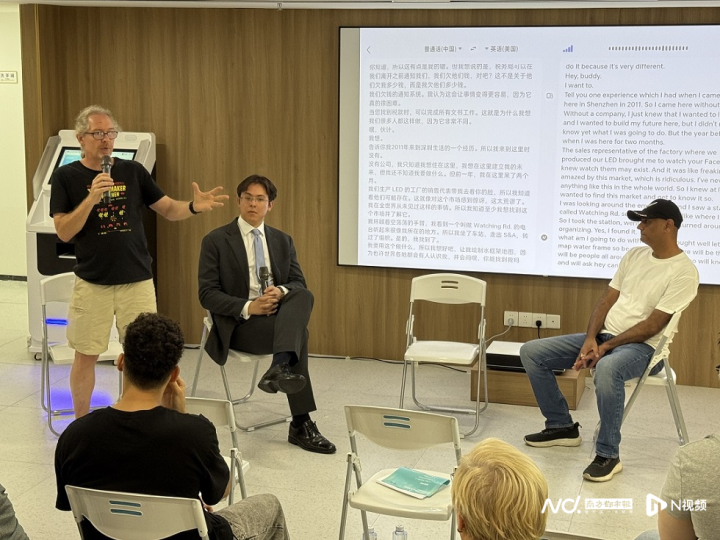 8月26日下午,深圳华强北航都大厦12楼洋溢着国际范儿。全球嘉宾济济一堂,现场85%以上为外国面孔,英语成为主要交流语言,来自华强北本地企业佳鳄智能提供的同声传译设备全程运转,确保沟通无障碍。现场迎宾机器人、接待机器人带来别样科技体验,中外嘉宾纷纷点赞“未来感”。